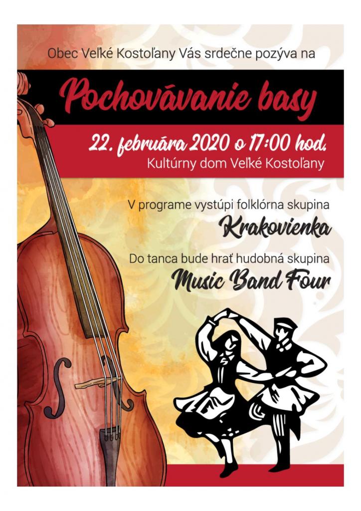 Obecný úrad Veľké Kostoľany Vás pozýva na ukončenie fašiangu - pochovávanie basy, kt. sa uskutoční v sobotu 22. februára o 17:00 hod. v sále kultúrneho domu. V programe vystúpi folklórny súbor Krakovienka a do tanca zahrá hudobná skupina Music Band Four.