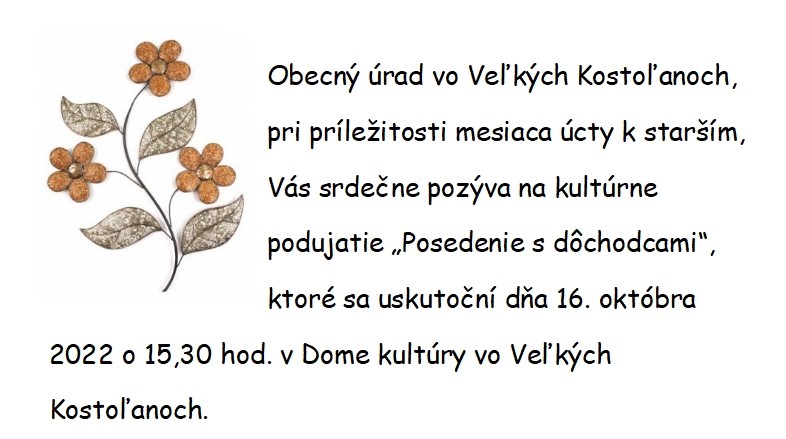 Obecný úrad vo Veľkých Kostoľanoch, pri príležitosti mesiaca úcty k starším, Vás srdečne pozýva na kultúrne podujatie „Posedenie s dôchodcami“, ktoré sa uskutoční dňa 16. októbra 2022 o 15,30 hod. v Dome kultúry vo Veľkých Kostoľanoch.