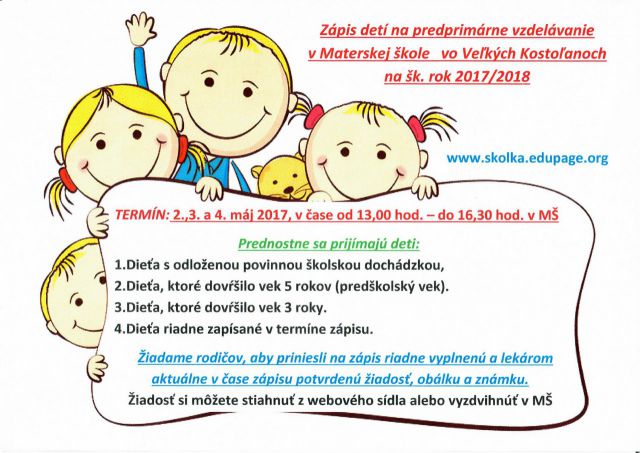Riaditeľka Materskej školy vo Veľkých Kostoľanoch oznamuje rodičom, že zápis detí na predprimárne vzdelávanie v Materskej škole vo Veľkých Kostoľanoch na šk. rok 2017/2018 sa uskutoční v dňoch 2., 3. a 4. mája 2017 , v čase od 13,00 hod. - do 16,30 hod. v MŠ